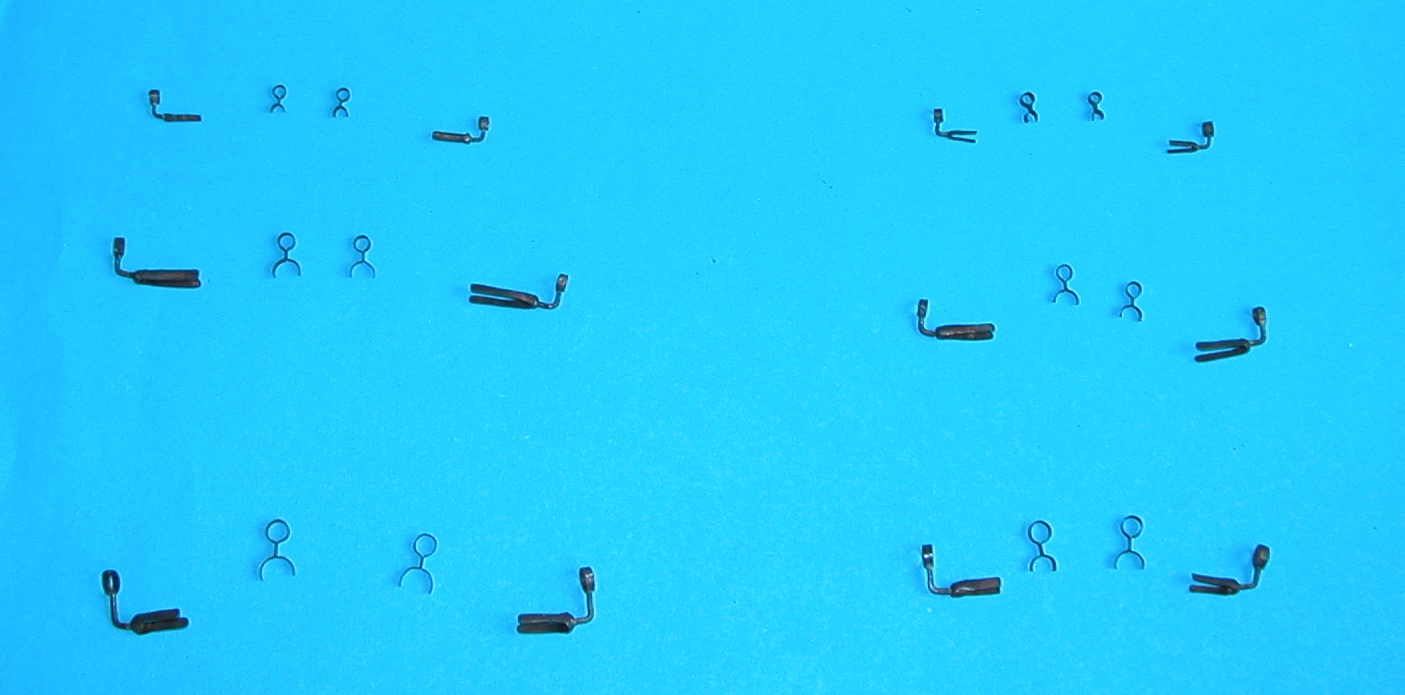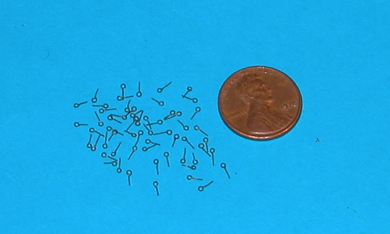 Udało mi się także zrobić ponad 200 (na foto tylko część) oczek, które posłużą jako prowadnice lin biegnących wzdłuż górnej powierzchni rei (nie wiem jak się one nazywają, a prawdopodobnie służą marynarzom do przytrzymywania się w czasie stawiania żagli). Oczka zrobione z drutu 0,3 mm, a średnica otworu 0,5-0,6 mm. Polutowane i poczernione.