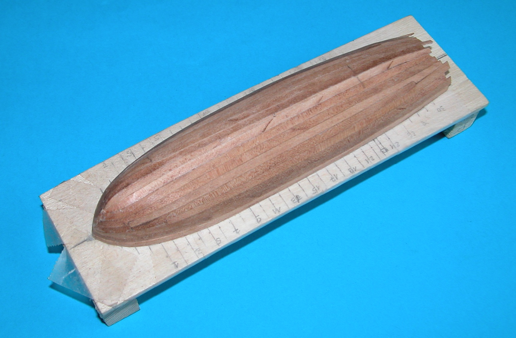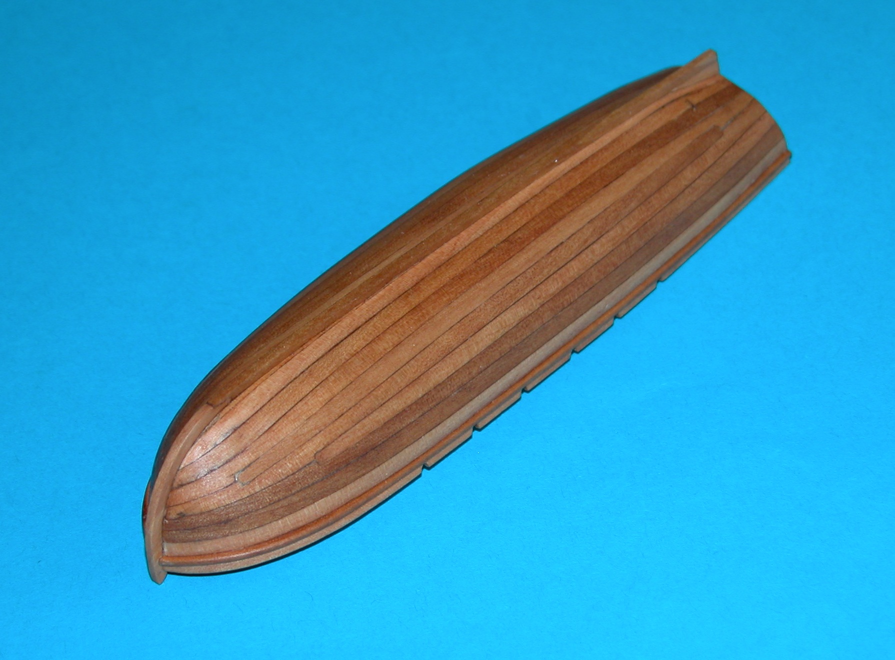 W wykonanym wcześniej kopycie wyżłobiłem rowek na nadstępkę, wcisnąłem ją w niego i zablokowałem w otworkach wywierconych w deseczce przykręconej do kopyta. Następnie wyżłobiłem w nim rowki na wręgi zgodnie z położeniem nacięć na nadstępce. Mogłem teraz wklejać w nadstępkę kolejne wręgi wciskając je jednocześnie w rowki w kopycie, a wolne ich końce blokując w wywierconych wcześniej otworkach. Dzięki zablokowaniu w rowkach kopyta wręgi były na tyle stabilne, że można było całość delikatnie wyrównać (choć nie obyło się bez połamania dwóch, już wklejonych) i wykonać odpowiednie skosy w części dziobowej i rufowej. Niestety nie mam dokumentacji fotograficznej – coś popieprzyłem z ustawieniami aparatu i wszystkie zdjęcia wyszły nieostre. Tak że poniżej tylko jedno foto z ostatniej fazy przyklejania planek (widać jednak na nim opisane wyżej rowki i wpuszczone w nie wręgi):