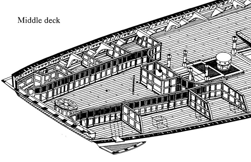 W Twoim rozwiązaniu nie dostrzegam międzypokładu z mesą i kajutami oficerów. Brak tego pokładu i oficerów wyjaśniałby czemu sprzymierzone siły francusko-hiszpańskie przegrały pod Trafalgarem i czemu Santisima Trinidad stała się (na krótko) pryzem brytyjskim
