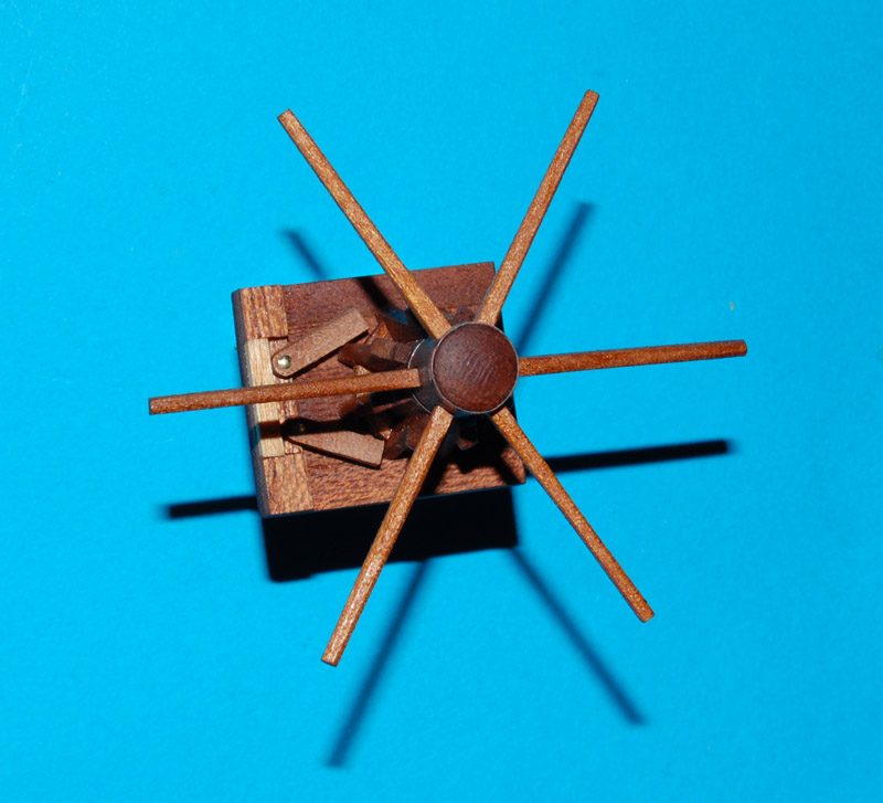 Następnie na wysokości żeber oszlifowałem głowicę, wstępnie nadając kształt ośmioboku, na to (analogicznie jak w kabestanie 2), nakleiłem osiem listewek z mahoniu.