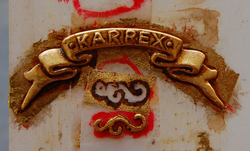 W skrócie: podkład czerwoną akrylową farbą (Renesans), szelak, mikstion, szlagmetal, szelak, farba olejna ("patyna").