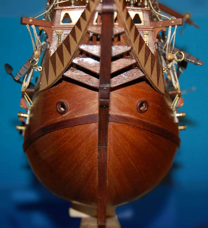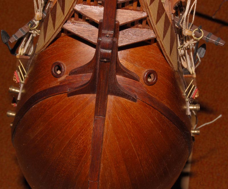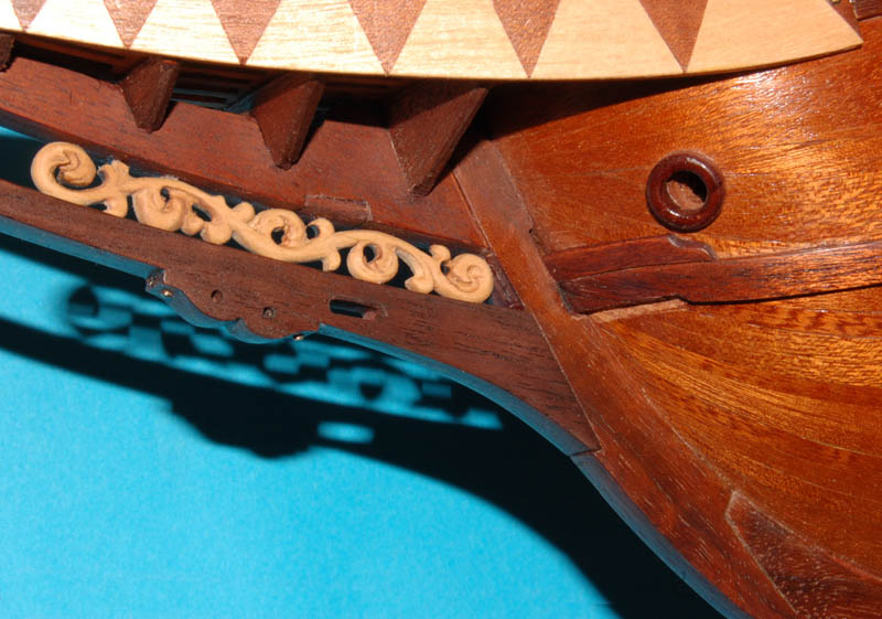 Odbojnice na dziobie już w kolekcji były że tak powiem "niewłaściwie wyprofilowane" tzn. brak jakiegokolwiek profilowania. Wiadomo prosta listewka na oble dziobu uzyska tylko jedną formę - zadarcia ku górze (w modelu to zadarcie wymuszało wcięcie w stewie dziobowej).