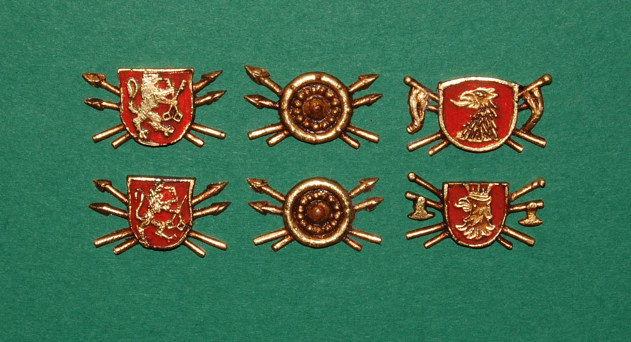 Natomiast flagi czy obuchy toporków to "wydłubałem" różnymi narządkami w plastelinowej formie i tak też robiłem pozostałe "panoplia", rzeźbiąc w negatywie zbroje, hełmy, bębny, trąbki, korony czy małe lwy (i wspomniany na wstępie herb). Niestety nie mam tutorialu wykonu i trudno by było takowy obecnie zrobić, bo detale te wykonywałem w lutym 2015 roku, ale mam tutorial (hucznie powiedziane