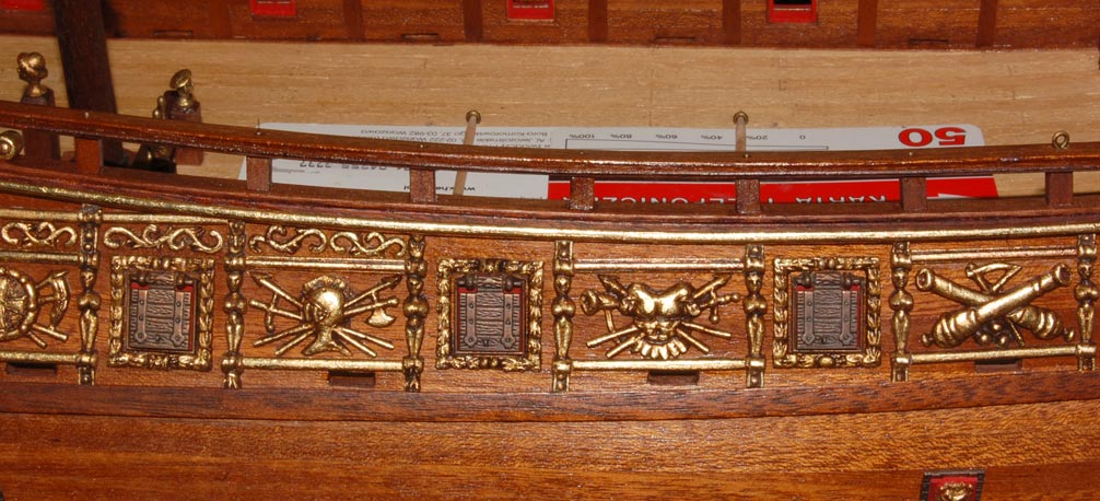 Na zakończenie tego etapu wkleiłem nad ornamentami pozłoconą listwę (półwałek) od dziobu do ławy wantowej bezana.