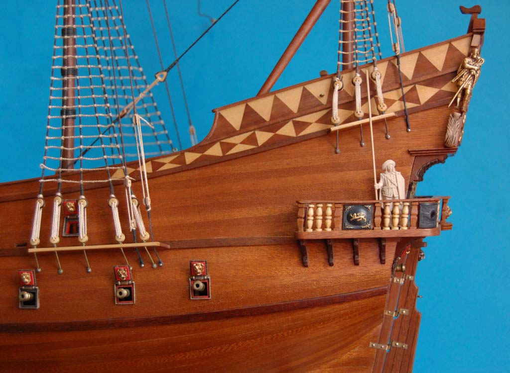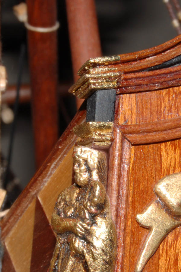 Z listewek forniru wkleiłem też "zaplecki" figur - było to potrzebne, aby wyrównać narożniki burt z ozdobną listwą na pawęży.
