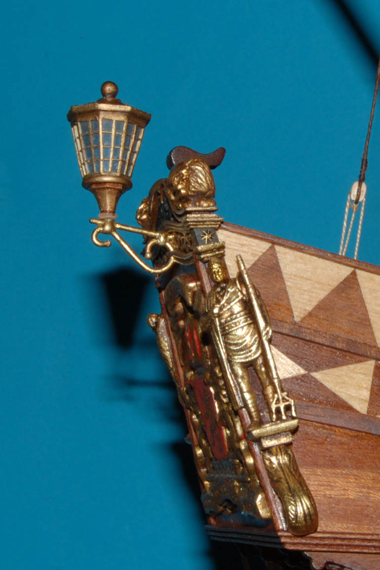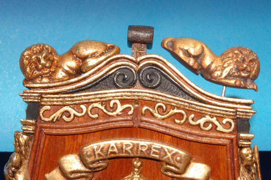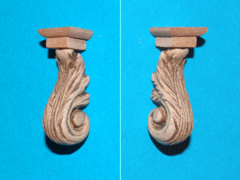 Jeszcze jeden detal konsoli - podstawa na której stanie figura. Powiem szczerze, że tu miałem znów dylemat czy konsolę z podstawą dać tak jak na zdjęciach poniżej, czy zgodnie z liniami listew na burcie (ta opcja bardziej mi odpowiada, lecz to wiąże się z innym uformowaniem figury - prawa noga zgięta). Druga sprawa to podstawa - dać ją prostopadle do burty, czy równolegle do linii wodnej - to jeszcze bardziej komplikuje układ nóg i stóp :evil: