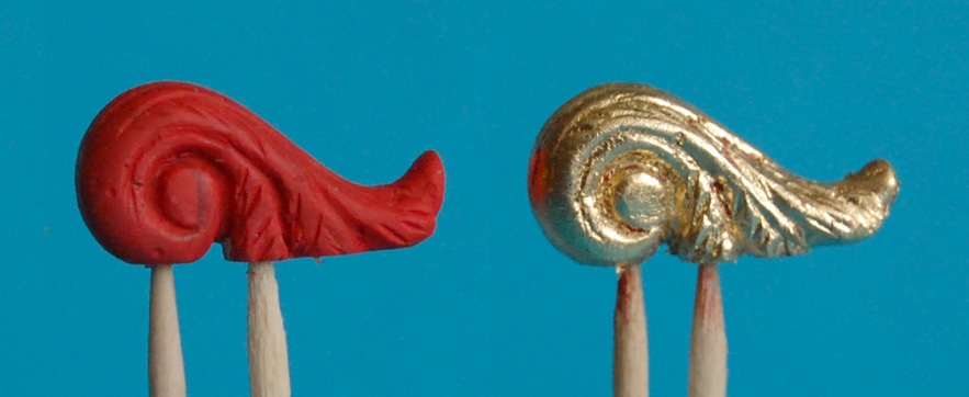 Pozłociłem gzymsiki, wkleiłem nowe detale ornamentów oraz lewki na zwieńczeniu (na kołeczki z drutu mosiężnego),