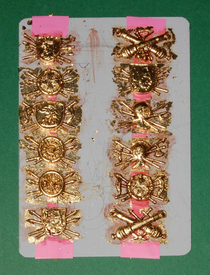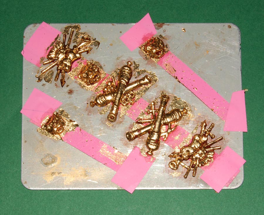 Pierwsze ozdoby - jak widać kolejne formy dział modyfikowałem dodając elementy broni, korony, kule dział, jak również pod tarcze, hełmy i zbroje (tego nie widać, ale we wszystkie drobne detale odstające jak "piki i strzały" zatapiam szpilki dla wzmocnienia).
