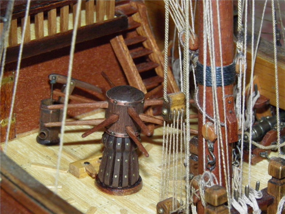 Kolejnym dość słabym detalem w kolekcji był kabestan. Robiłem go wg instrukcji (z braku odpowiedniej wiedzy :oops: ), jedynie zamiast mosiężnych handszpaków z drutu, dałem drewniane z wykałaczek. Nie przyklejałem też listewek na pokładzie wokół kabestanu, bo wydawały mi się (zresztą słusznie) zbyteczne.