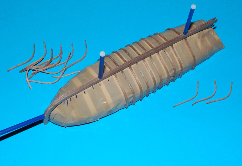 Wręgi wykonałem ze sklejonego forniru z listewek o szerokości 1,5 mm i gr. 1,2 mm, formowane do kształtu na parze.