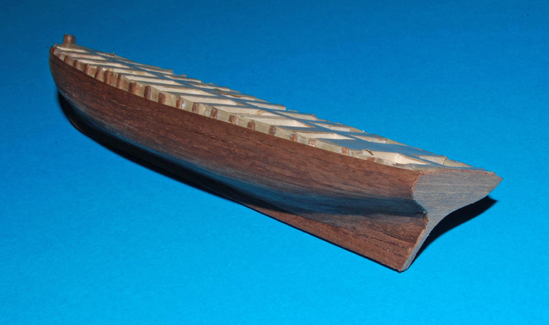 W kopycie nie wypełniłem przestrzeni między wręgami, więc wyciąłem folię w dostępnej części kopyta i przy klejeniu listewek na burcie dociskałem pęsetą, a na dnie podkładałem klocek.