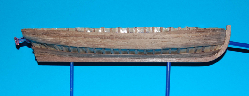 W kopycie nie wypełniłem przestrzeni między wręgami, więc wyciąłem folię w dostępnej części kopyta i przy klejeniu listewek na burcie dociskałem pęsetą, a na dnie podkładałem klocek.