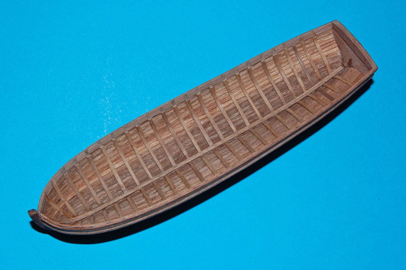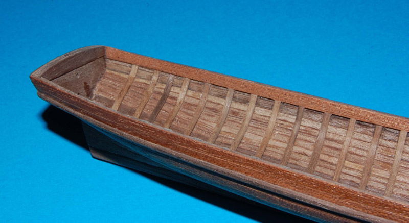 Wyrównałem krawędzie burt i nakleiłem listwy odbojowe (uformowane do kształtu na parze). Wewnątrz między wręgi wkleiłem kawałki listew (trochę dłubaniny ). Końcówki wręgów ścieniłem, żeby już nie pogrubiać krawędzi burt. Na to zostanie naklejona listwa mahoniowa, wykończeniowa.