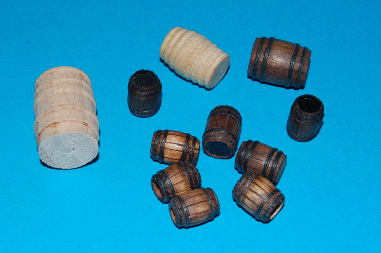 Jako że na pokładach znajdowało się dość sporo beczek, różnych wymiarów (z wodą, prochem, napojami rozweselającymi, itd.), to kilka na trzeci pokład już zacząłem robić (nieco mniejsze niż z zestawu sekcji - te dwie jasne toczone z buku).