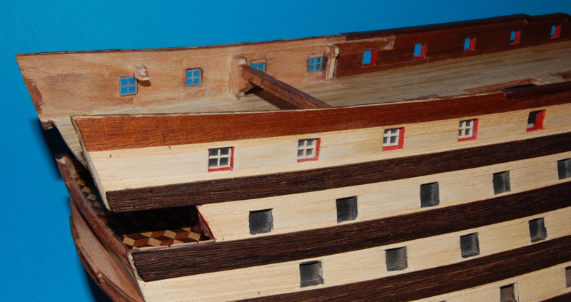 Kilka miesięcy temu, przy robieniu okien na burcie rufy, miałem obiekcję co do usuwania pokładnika, ale teraz go usunąłem wraz z kawałkiem wręgi i wyciąłem te brakujące otwory. Bo jak nie teraz, to już nie będzie kiedy, bo więcej przeróbek nie planuję.