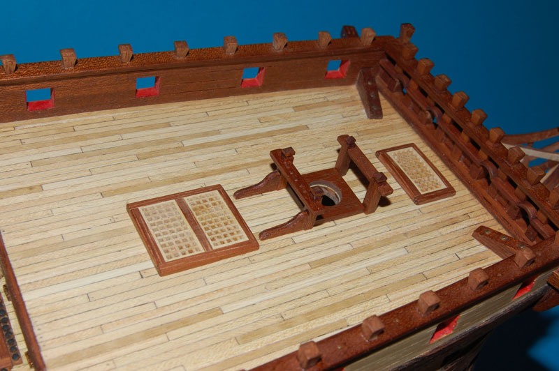 Zmieniaj lokalizację koła sterowego (o ile nie uparłeś się, aby model odzwierciedlał historyczny oryginał) - ja w swoim Montanesie umieściłem koło sterowe tak aby było widoczne - warto tak dopieszczone elementy jak wykonane przez ciebie koło sterowe wyeksponować - i dodatkowo będzie też bardziej widoczny naktuz - także wykonany z dbałością o szczegóły.