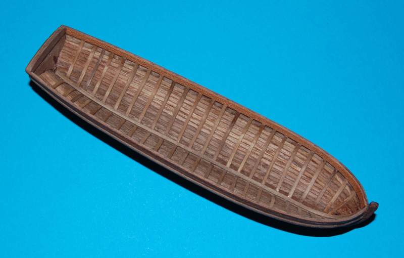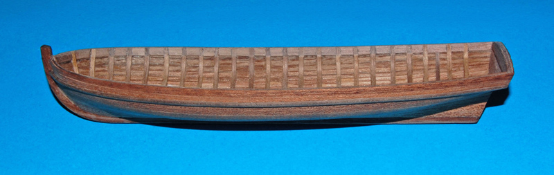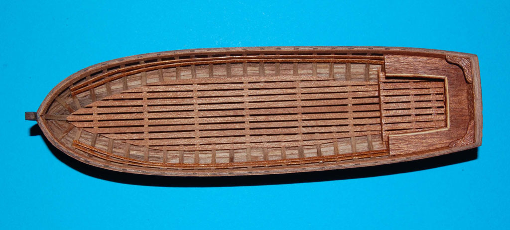 Wyrównałem krawędzie burt i nakleiłem listwy odbojowe (uformowane do kształtu na parze). Wewnątrz między wręgi wkleiłem kawałki listew (trochę dłubaniny ). Końcówki wręgów ścieniłem, żeby już nie pogrubiać krawędzi burt. Na to zostanie naklejona listwa mahoniowa, wykończeniowa.
