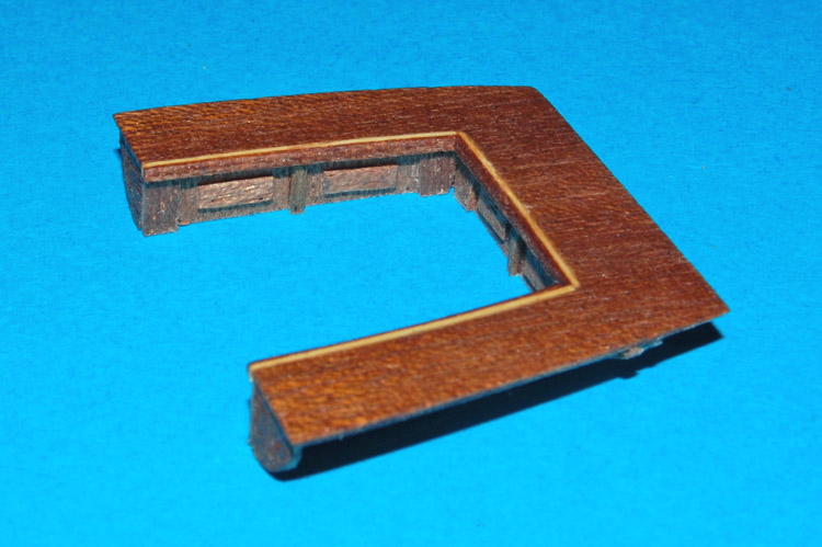 Listwy wewnętrzne (mahoń sapeli) wyciąłem wg kształtu zewnętrznych tylko z naddatkiem (szersze) i wkleiłem wykończając wewnętrzne krawędzie burt. Naddatek po wyschnięciu ściąłem i wyszlifowałem wyrównując z krawędzią. Nakleiłem też szerszy pasek forniru na stępkę (to w poprzednim poście).