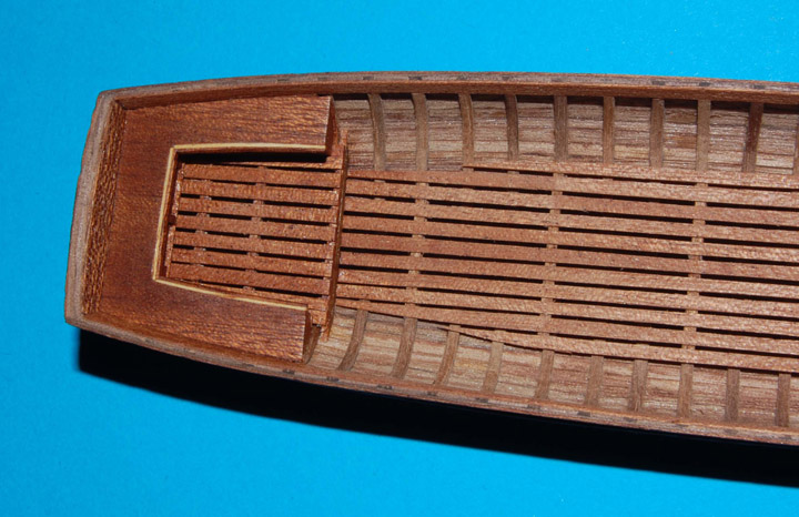 Kolejne elementy to gretingi (listwy z meranti o szer. 2 mm), "główny" i "rufowy" (sternika). Tak jak poprzednio najpierw zrobiłem szablony i wg nich wyciąłem gretingi. Niestety nie obyło się bez błędu, który wyszedł po zrobieniu gretingu rufowego. Wynikło to z tego, że przesunąłem ostatnią ławkę wioślarzy do tyłu* (tym samym skróciłem greting rufowy) i uwidoczniły się zakończenia listew gretingu głównego.