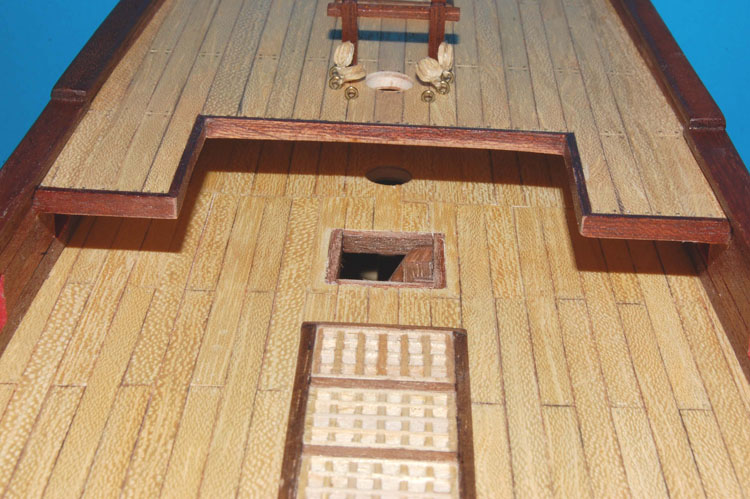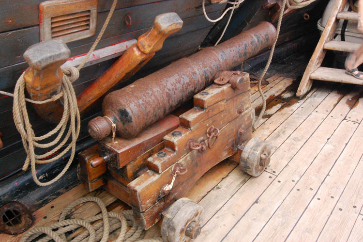 armaty po prostu inaczej ustawiano. Bardzo popularne było ustawienie wzdłuż burty i mocowanie do niej w tej pozycji, zdarzało się mocowanie (bardzo dokładne, dające kompletne unieruchomienie) do pierścieni usytuowanych w różnych miejscach pokładu (tak, jak na obciętej części tego rysunku są ustawione obie 12-funtówki na pokładzie dziobowym - mocowanie pominięto dla uproszczenia).