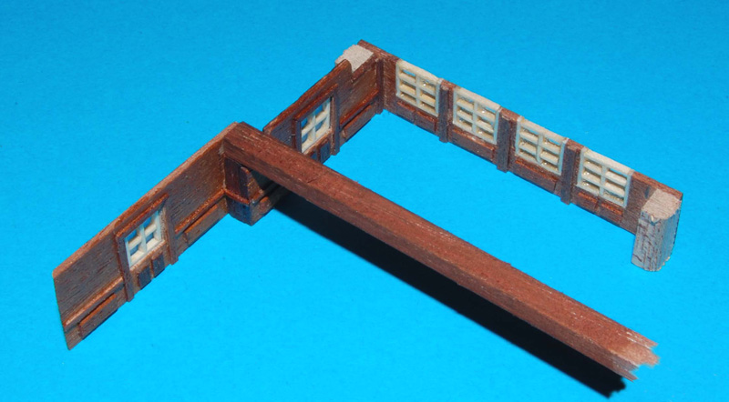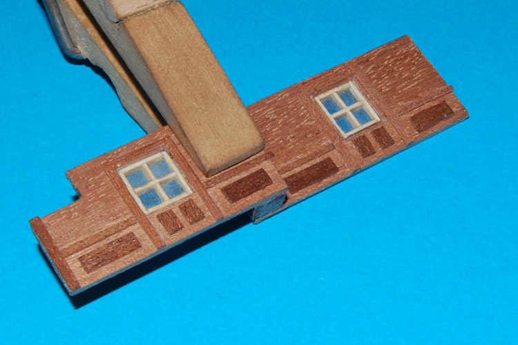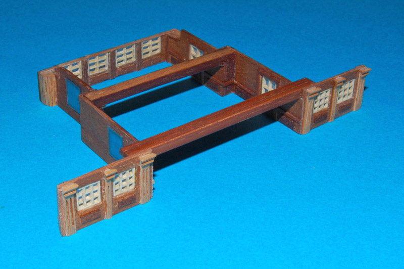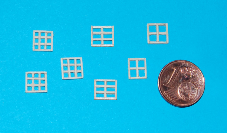 Ścianki są z obłogu (1 mm) meranti, okna (ok. 7 x 7 mm) wykonałem z forniru jesionu z dwoma, trzema i czterema szprosami (sposób wykonania okien jest w relacji, więc nie powtarzam :) ).