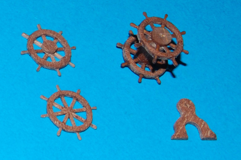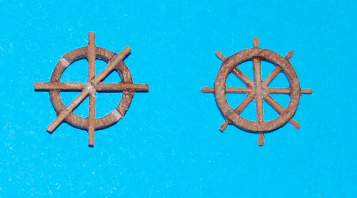 z lewej "kolka" sterowe z zestawu, za duze, toporne i majace osiem szprych (zamiast dziesieciu), z prawej moja wersja tego podwojnego kola sterowego.