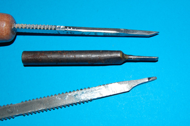 Do zrealizowania tego pomysłu potrzebowałem nowych dłutek, które wykonałem z odpadów (z okuć do okien). Mam dłutko 3 mm, dwa nowe 1,5 mm i 2,5 mm.