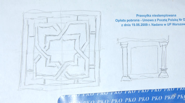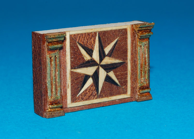A tak poważnie, w trakcie prac koncepcyjnych zastanawiałem się którą opcję wykonania zastosować: malować ten ornament brązą (bronzą, bronzom, brązem, bronzem - niewłaściwe skreślić) czy zrobić intarsją. Na intarsję zbyt skomplikowane ze względu na wielkość, a Róża Wiatrów jest jeszcze (jak widać) w zasięgu moich możliwości :lol: