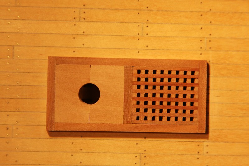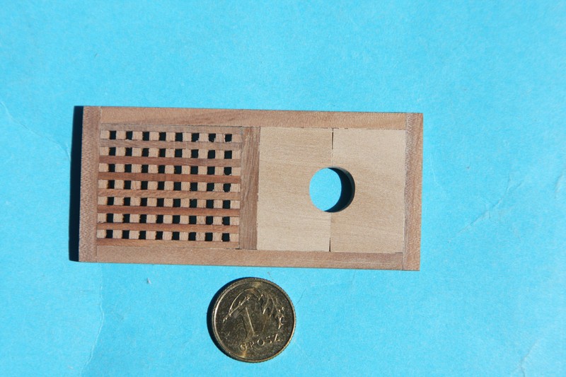 W chwilach wolnych pogrzebałem przy pokładzie rufowym.Najpierw wyciąłem z tektury wzornik,który po doszlifowaniu posłużył do wycięcia gretingów (podobnie jak przy dziobie produkcji Pana Mirka).