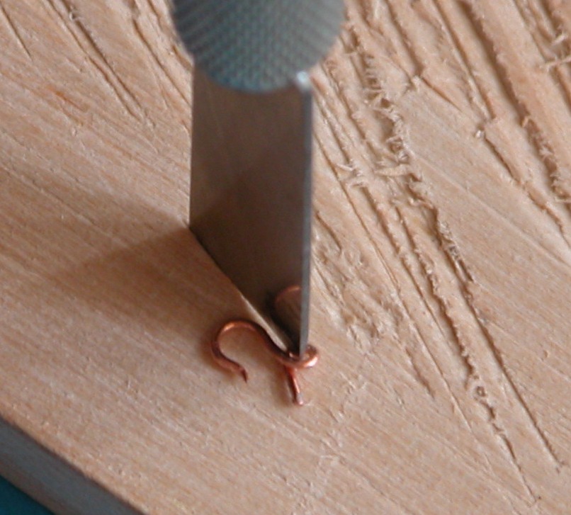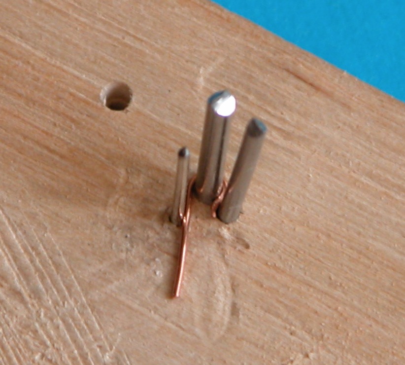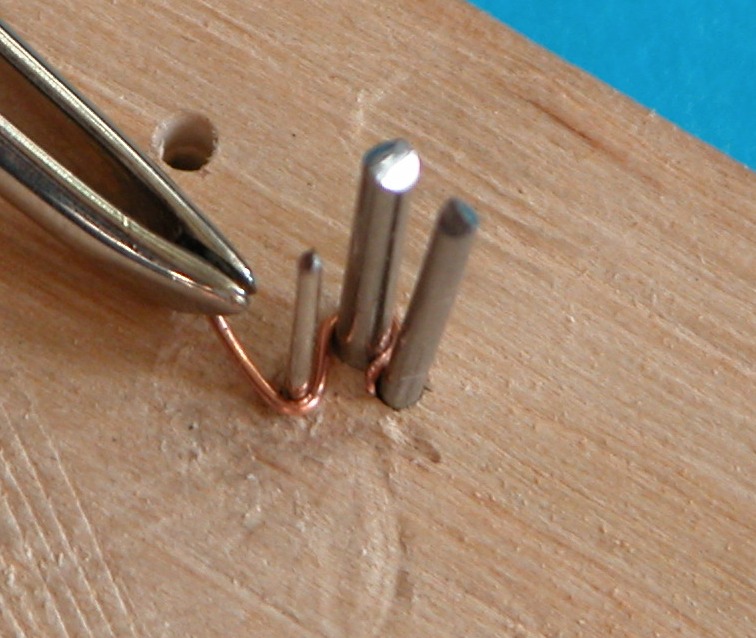 Umieściłem toto w przygotowanym wcześniej "ustrojstwie", tak aby wstępne podgięcie końcówki znalazło się między grubszymi prętami. Zastosowałem gwoździki o śr. 1,6 mm (ale można śmiało cieńsze), bo tak mi wychodziło z proporcji. Szpilka, na której formowane jest oczko ma śr. 0,7 mm).