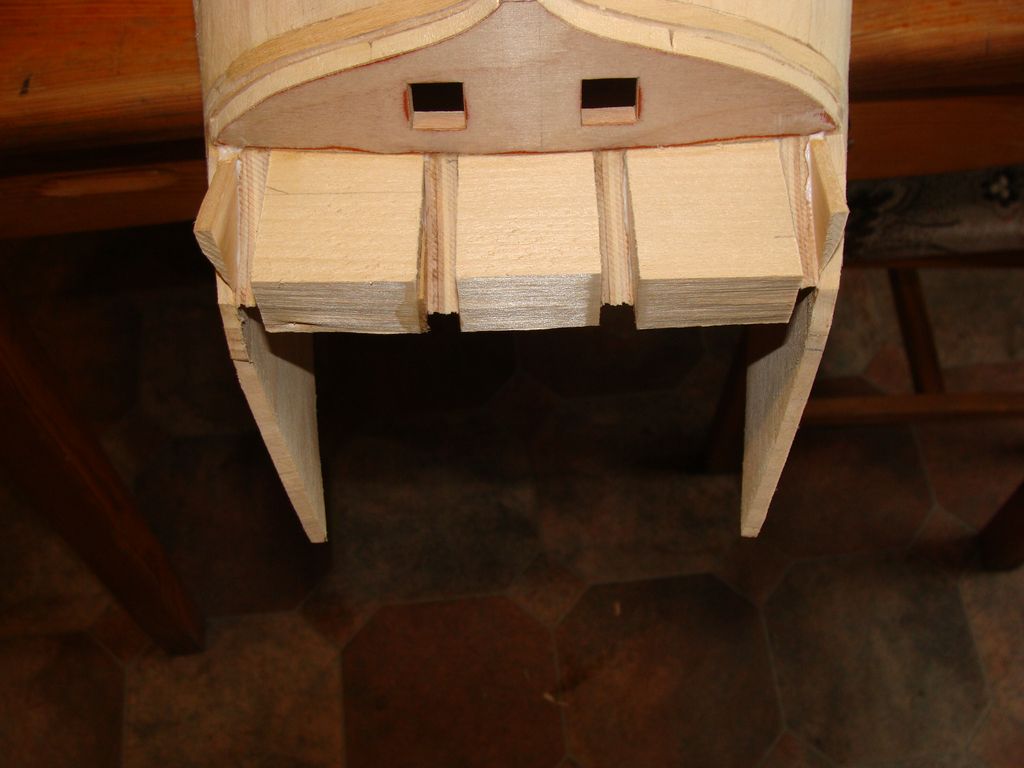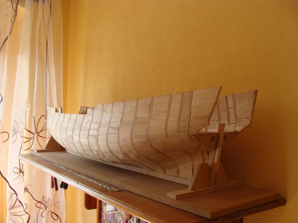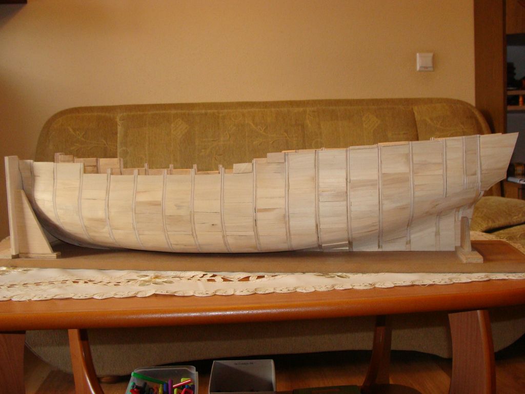 Burty zostały wyrównane, już nie wystaja nierówne wręgi.Wypełniłem też dziód deseczkami lipowymi.Kadłub narazie wstępnie oszlifowany szlifierka kątową. Wstawiłem też tymczasową stępkę ze sklejki, kiedyś zastąpie ją właściwą.