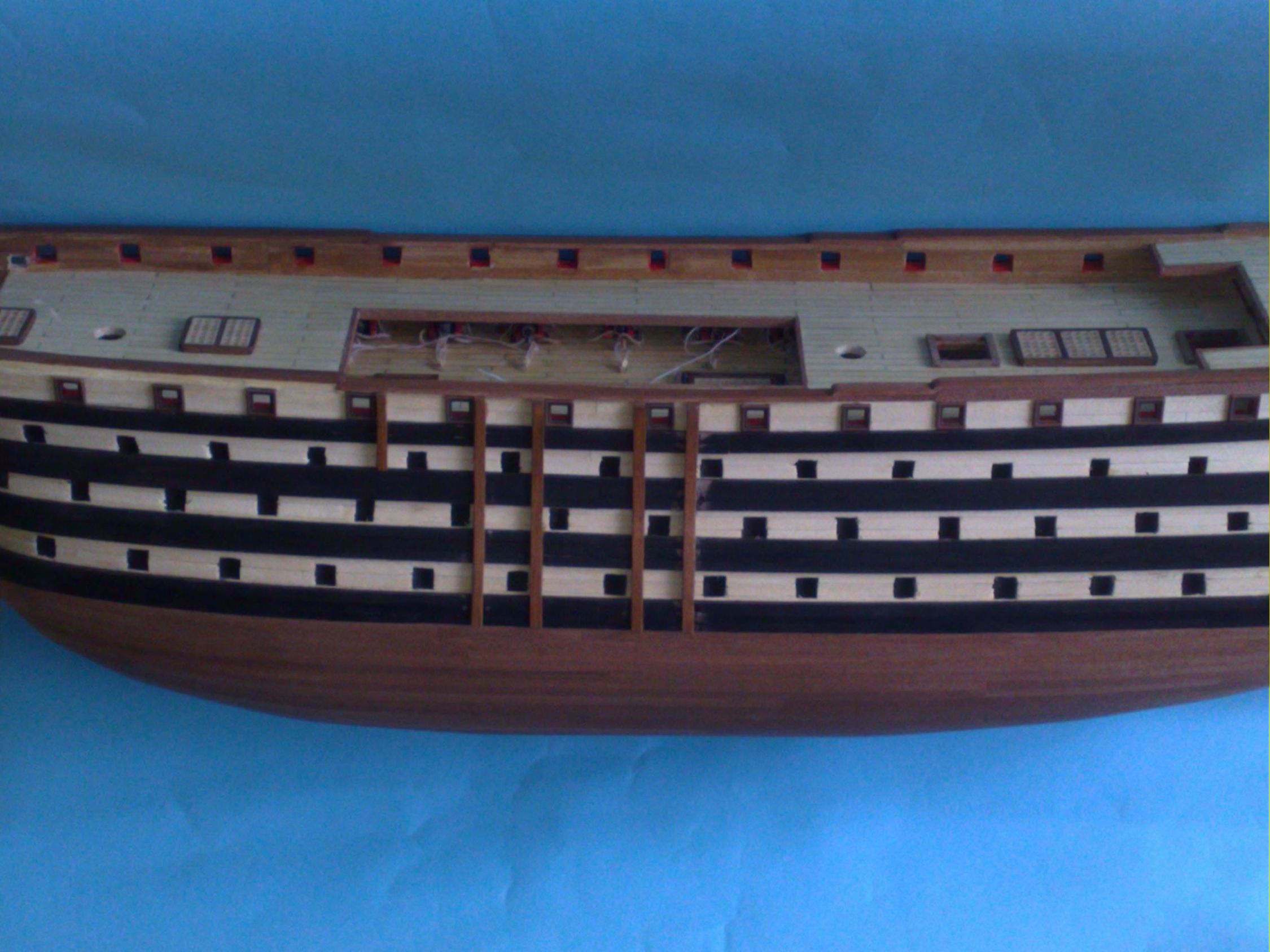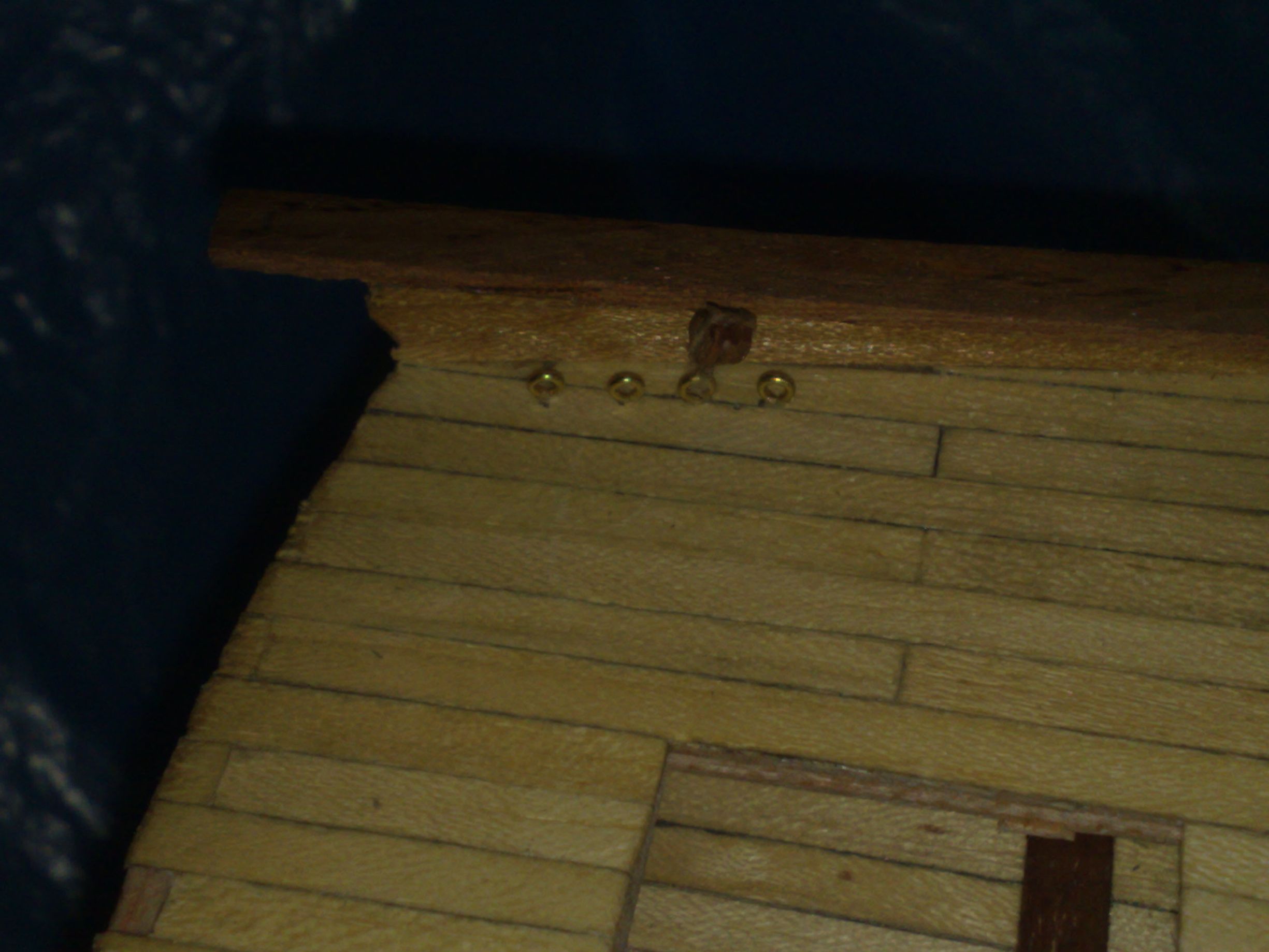 [b]Wykonałem wzmocnienia na burtach do tego celu posłuzyły mi listwy z orzecha afrykańskiego 2x4 mm które to wkleiłem najpierw pod spód a nastepne z 3 sklejonych pasków forniru ukształtowałem i przykleiłem do burty.