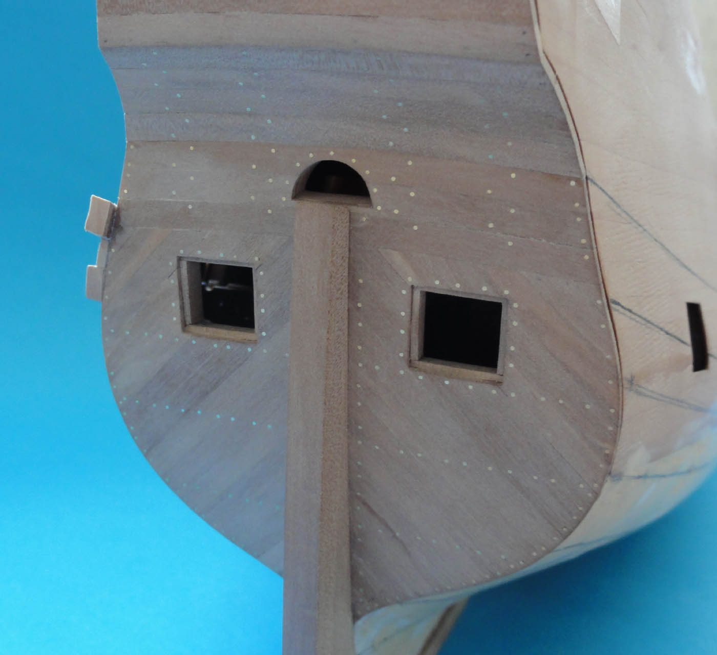 ...w miejscu osadzenia listwy w stewie dziobowej - rabbet (rowku biegnącym po całej długości od stewy dziobowej, przez stępkę aż stewę rufową) krawędź listwy została lekko spiłowana pod kątem tworząc pseudo klin :D ... rozwiązanie to eliminuje klejenie "na styk" do stewy... i nie powoduje odklejania się listwy w tym miejscu przy doginaniu jej do kształtu kadłuba... jest zaklinowana :P