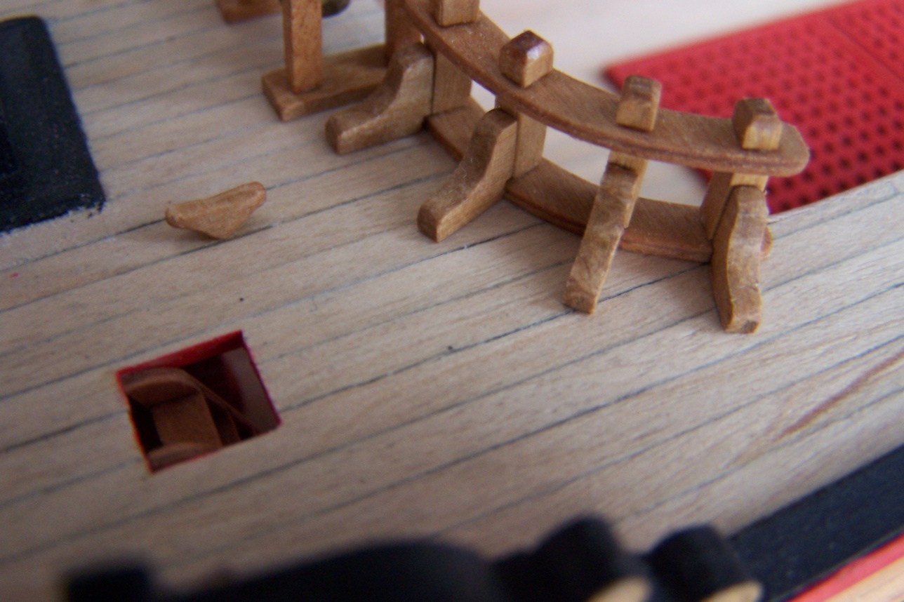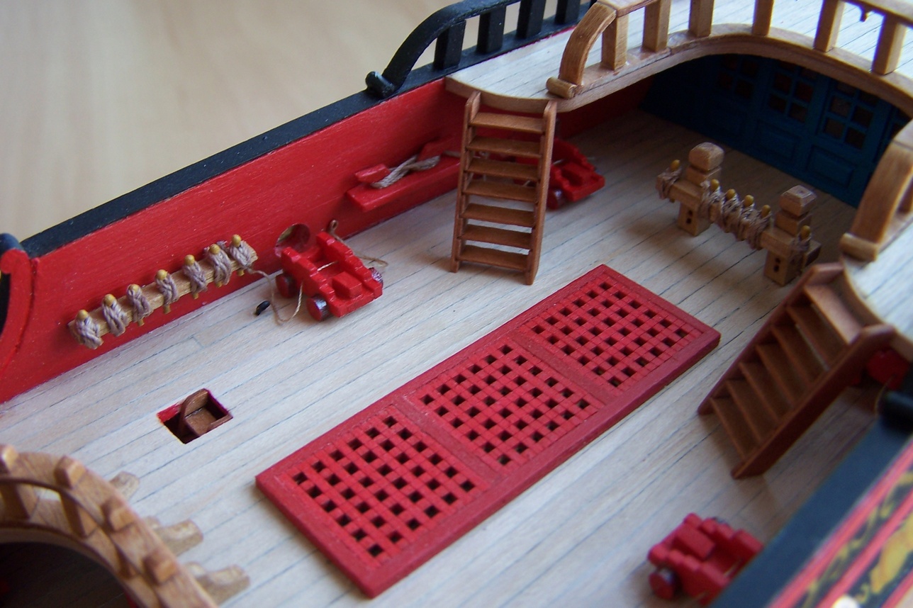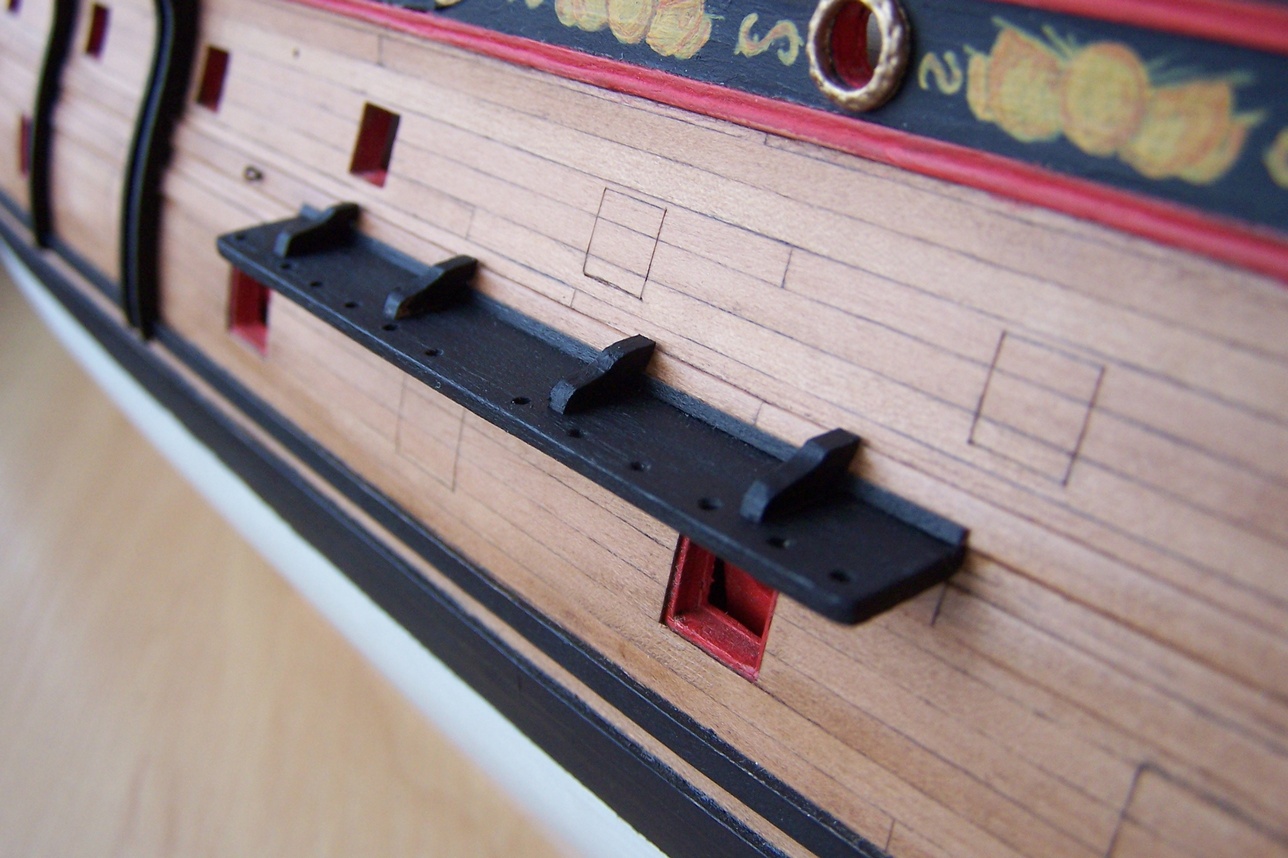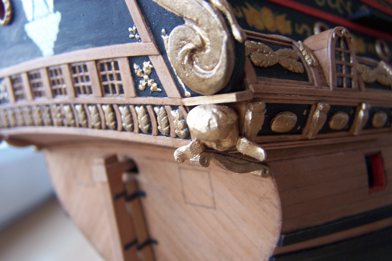 Cześć.Przybyło trochę drobiazgów.Skończyłem zdobienia na rufie.Zamocowałem ostatnie lawety jeszcze bez armat, a na koniec schodki na burtach.Jednym słowem nuda