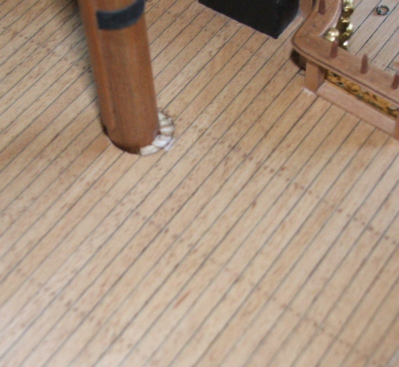 Adamie widzę otwór pod maszt.Czy masz już dopasowane maszty.Mnie masę problemów sprawiło dopasowanie wszystkich masztów żeby były wszystkie w osi pokładu i pionowo.Otwór w pokładzie dolnym musiałem zrobić duży dopiero w górnym klinowałem.O ile się pomyliłem zobacz.Zakryję to pierścieniem .R