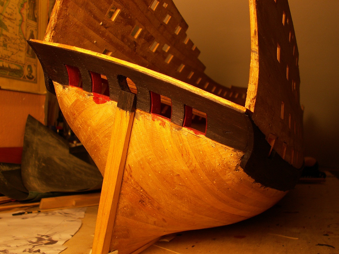zagajnik na lewej burcie ścięty, podlany 3x hebanem+1raz caponem, na prawej powoli rośnie nowy. Ogólnie to gładziłem 1000 i filcem- a potem i tak heban (a raczej wilgoć bejcy )wyciągną słoje. Wygląda to tak: