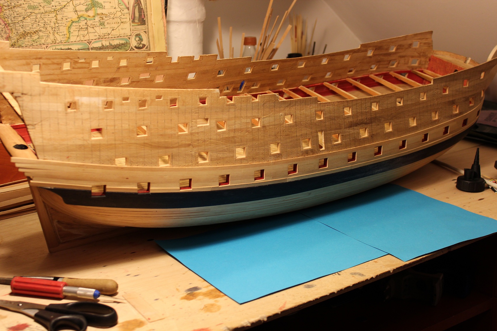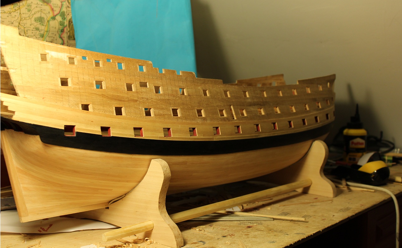 Wrzucę kilka fotek z powolnej budowy, aż mi wstyd mego tempa... Część "felców" mam, co widać na prawej burcie głównego pokładu bateryjnego. Przybyło również trochę poszycia. Chyba 1/2 pod linią wodną jest już na "surowo" jeszcze drugie 1/2 i będzie pod linią wodną zrobione.