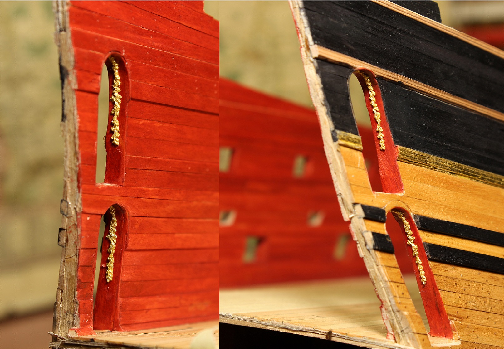 Dręczyło mnie, że źle, a racze,że może być lepiej zrobione. Wywaliłem, nowe wstawiłem. Kolejno wywalę jeszcze trzy. Szkoda tylko tego złota. Schowam gnioty do pudełka, może kiedyś coś z nich jeszcze odetnę i gdzieś wstawię. Nowa sztuka jest drobniejsza. Z tym złoceniem drobnych elementów jest kłopot taki, że mazidło na które przyczepiam płatki złota jest gęste, przez co zalepiane są szczegóły. Teraz jest tak