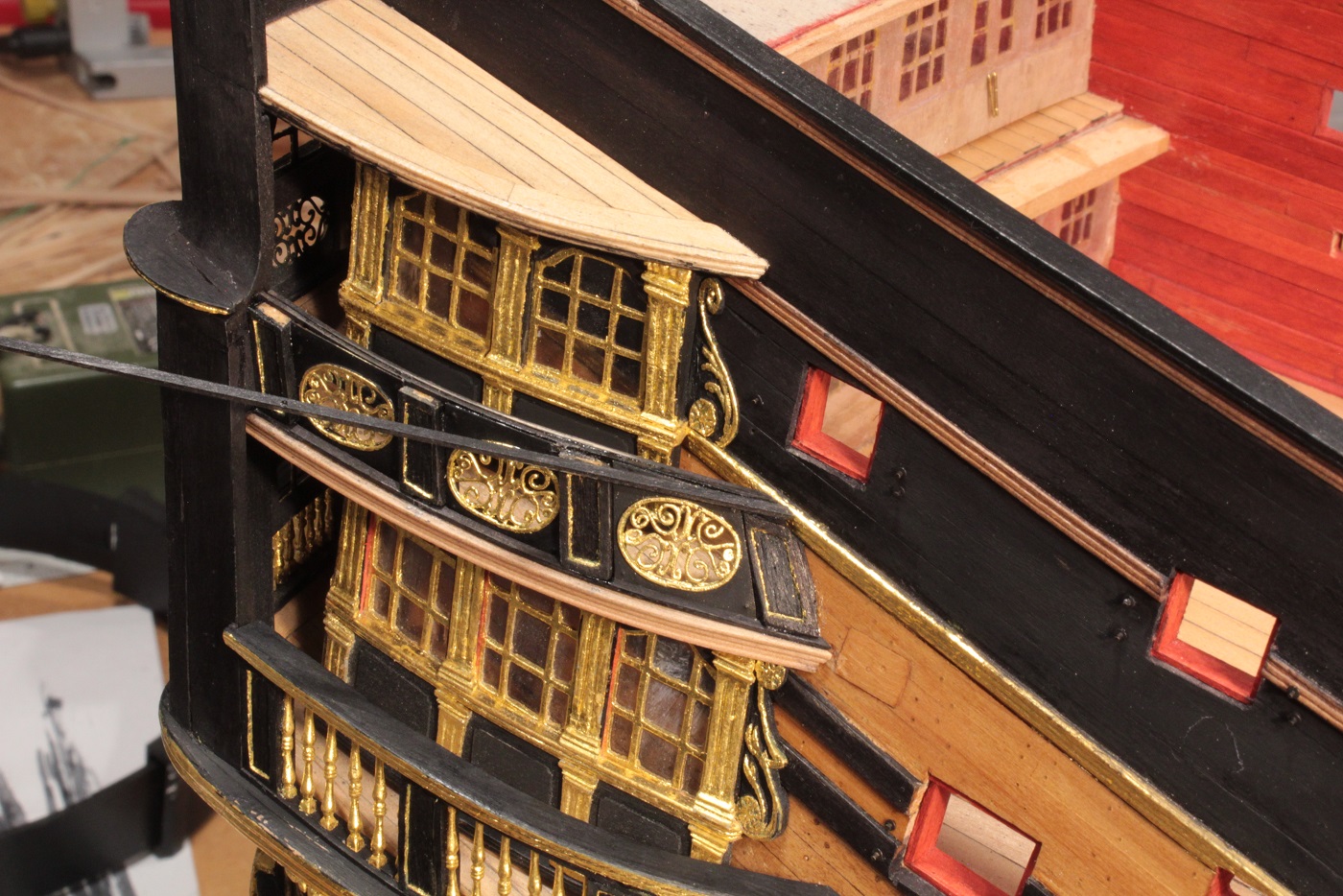 Myślałem, że zrobię więcej. Skończyło się tylko na złoceniu na ćwiartce rufowej na prawej burcie. Pas balustrad na poziomie II pokładu mam gotowy.