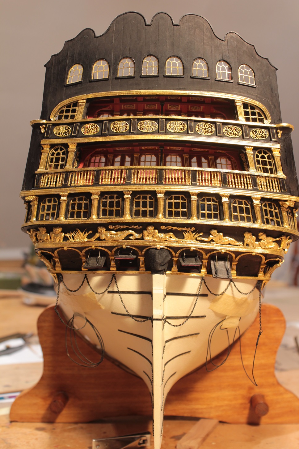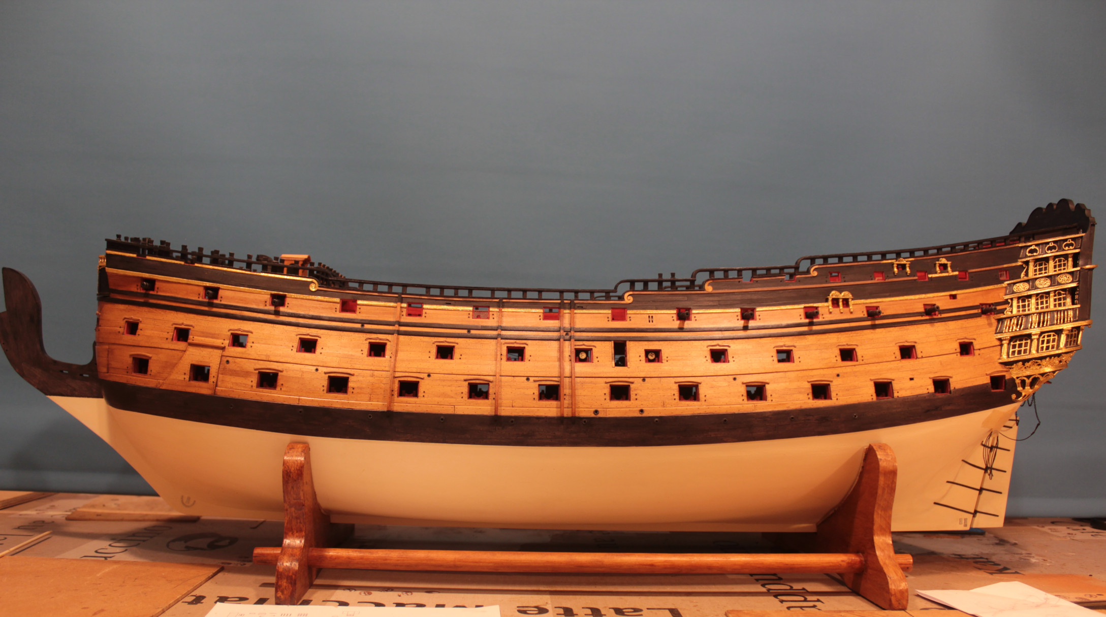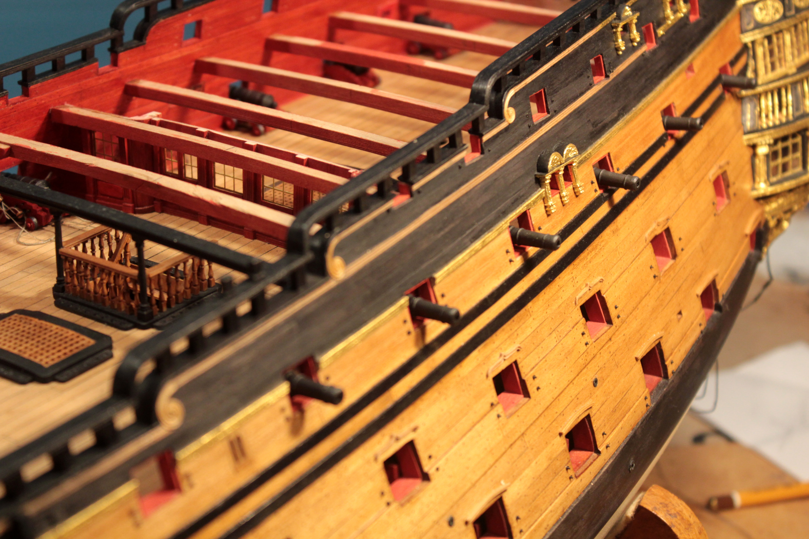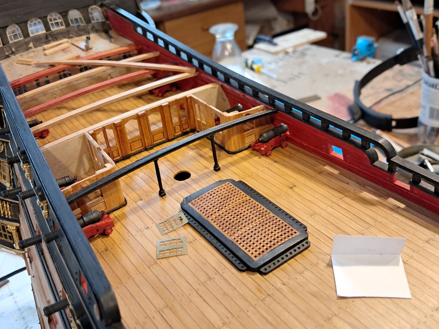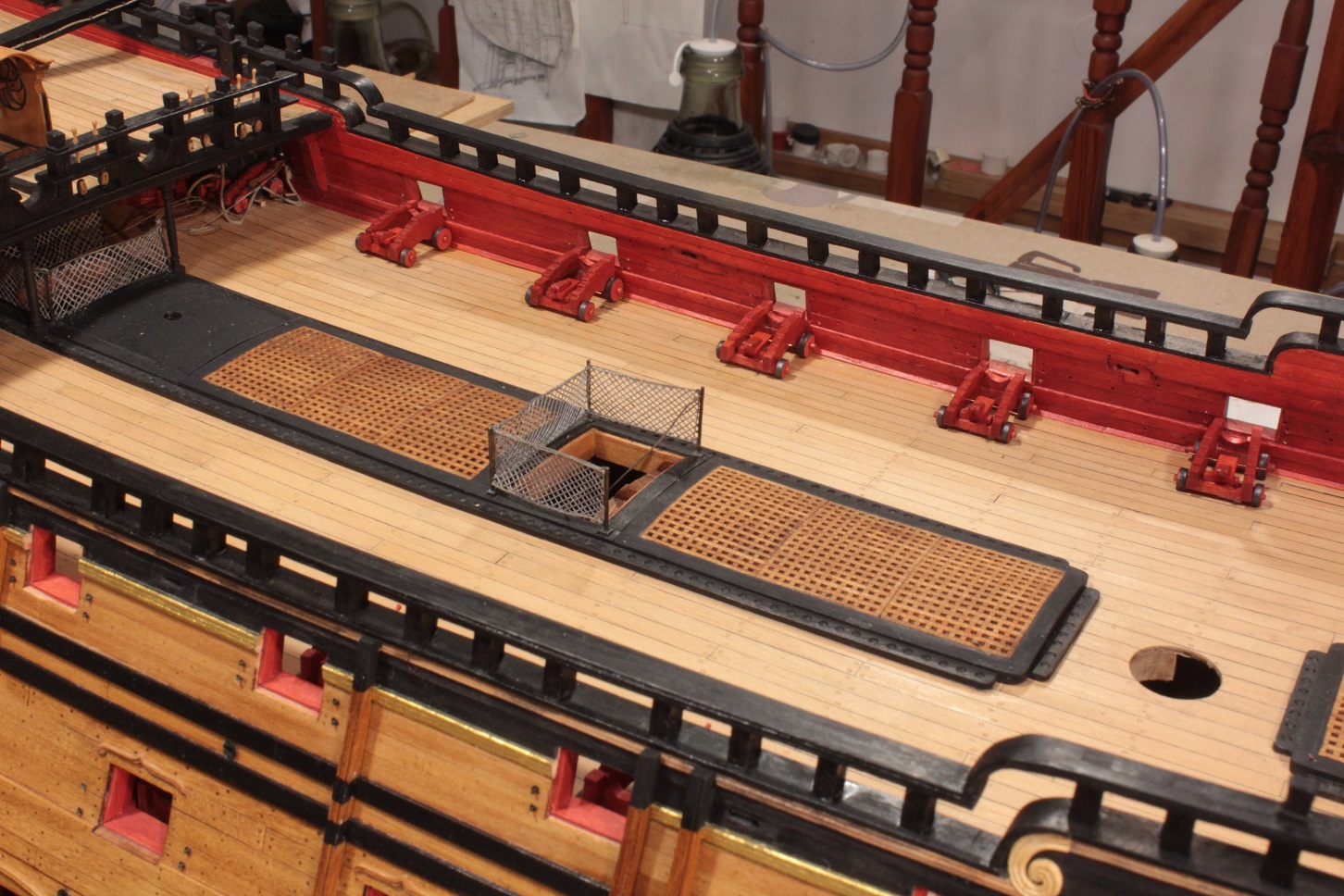 Dziś uporałem się z ostatnimi kółkami lawet do dział 18- funtowych. Lawet jest 22 sztuki. Najlepszych 16 sztuk będzie zrobione bez uproszczeń. Pozostałe przykryje pokład rufowy.