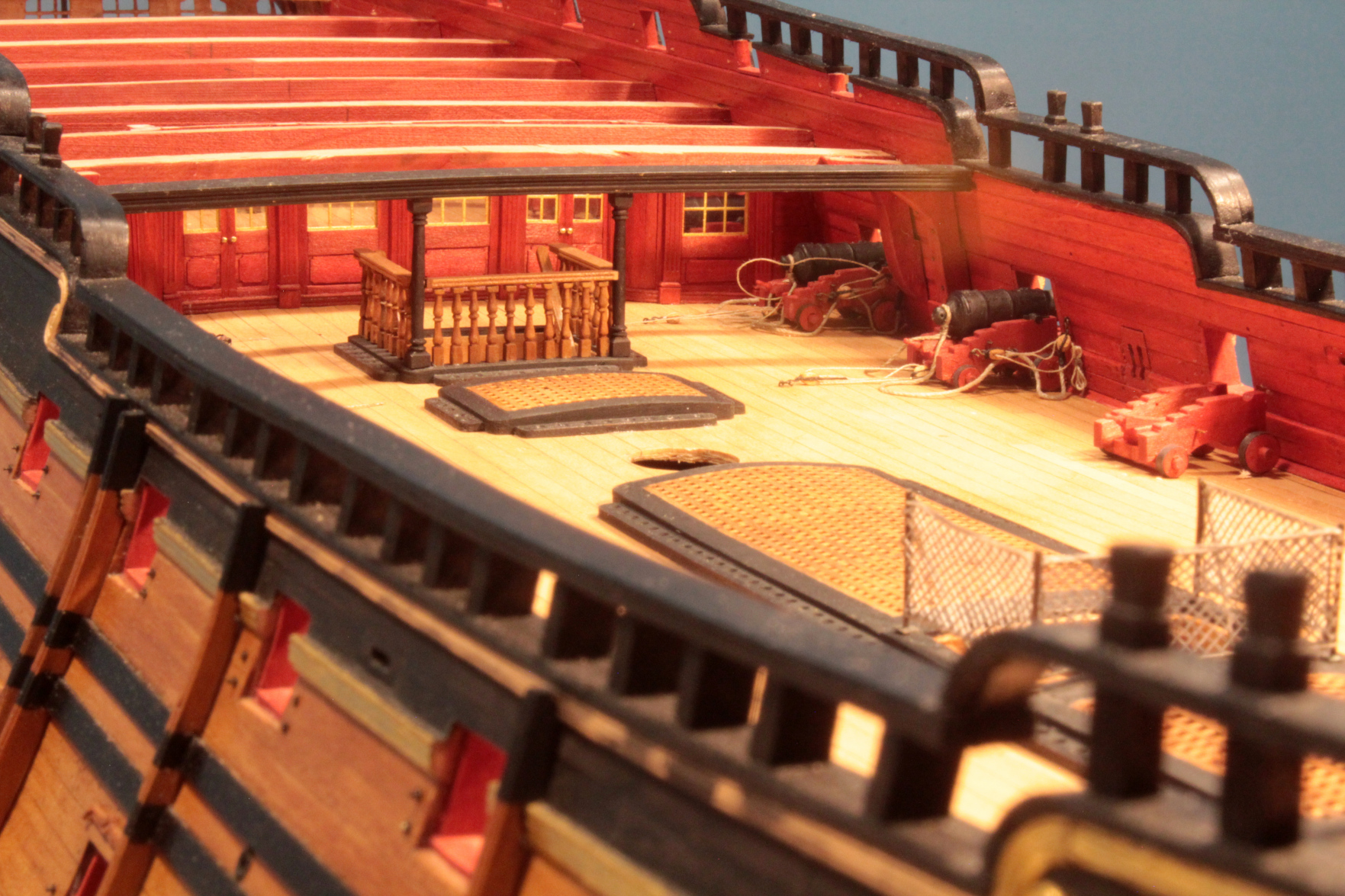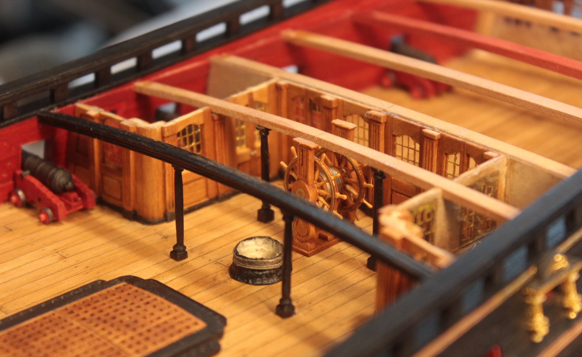 Zamocowałem na gotowo cztery lawety z działami umieszczone przed ścianką działową. Pomimo że działa będą przykryte ćwierć pokładem rufowym, to ich talie będą widoczne. Działo na lawecie jest porównywalne z jednogroszówką, a są to 18 funtowe armaty.