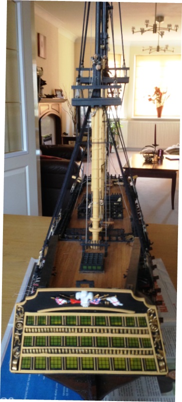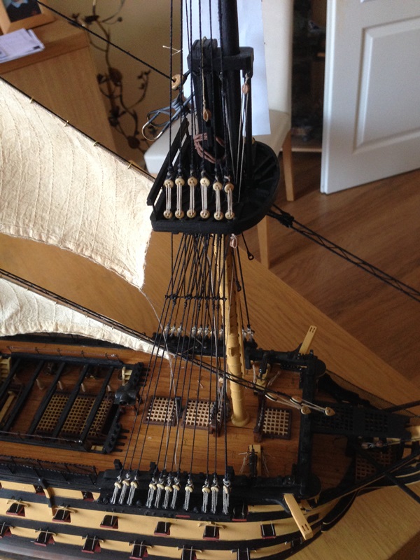 Zaczęły się sznureczki. Na pierwszy ogień poszły wanty fokmasztu. Wydawnictwo proponuje wiązanie węzłem płaskim ja spróbowałem naśladować oryginał. Troche to trudne przy zbudowanym maszcie, ale jakoś sobie poradziłem: