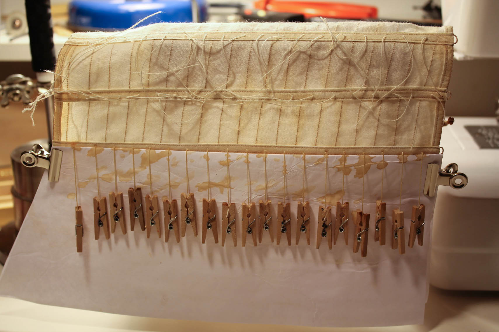 Żagiel malowany herbatą nakładaną pędzelkiem tylko w niektórych miejscach na mokrą tkaninę.