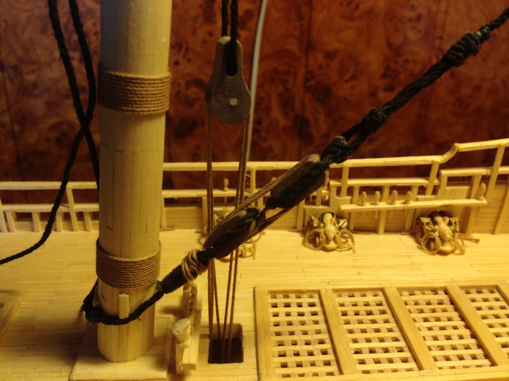 Na modelu Claytona przy bloku w bezanmaszcie od strony pawęży widać jakby "pieczęć" na linie,