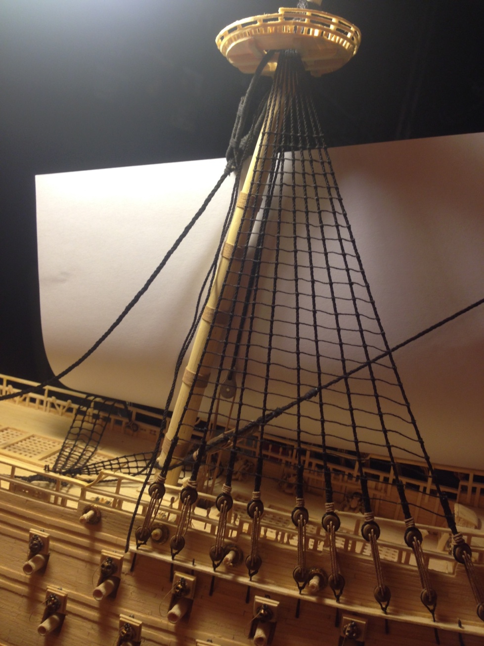 1) W jaki sposób mocowany był wyższy poziom masztu, gdzie była uwiązana ta lina, nie udało mi się tego dojrzeć na żadnym z modeli. Wydaje Mi się,że ma to związek z hakami umieszczonymi przy połączeniu masztów.