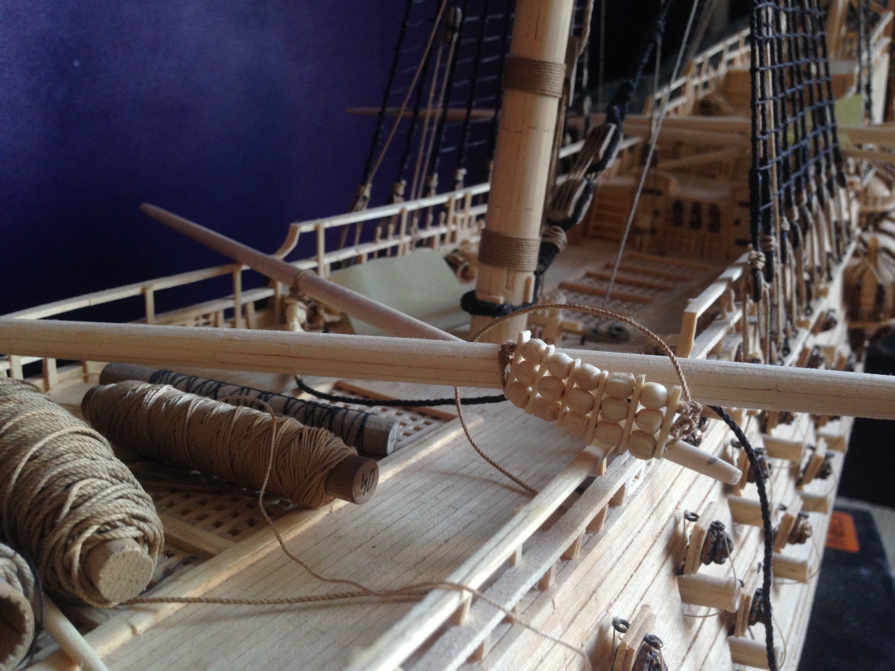 Zawiązałem wyblinki na wantach grotmasztu, oraz na sztagu zrobiłem "pełnoprawną" gałkę.