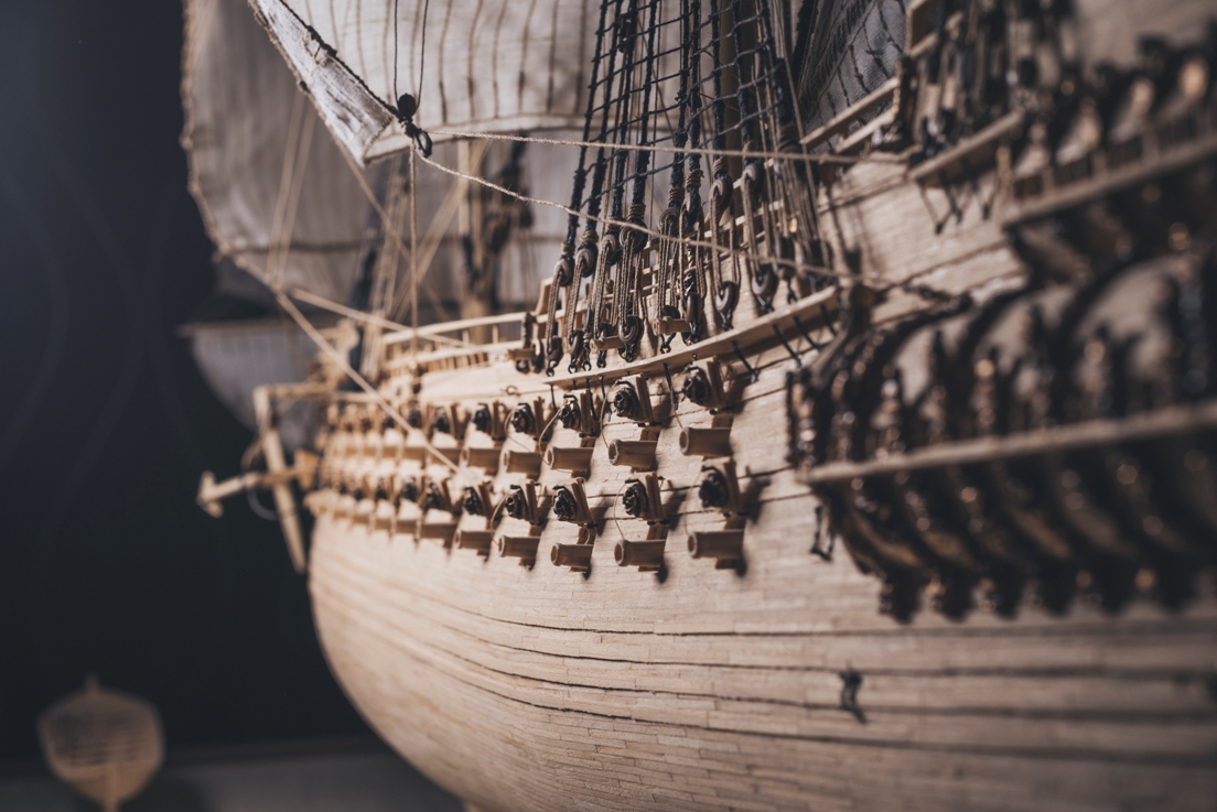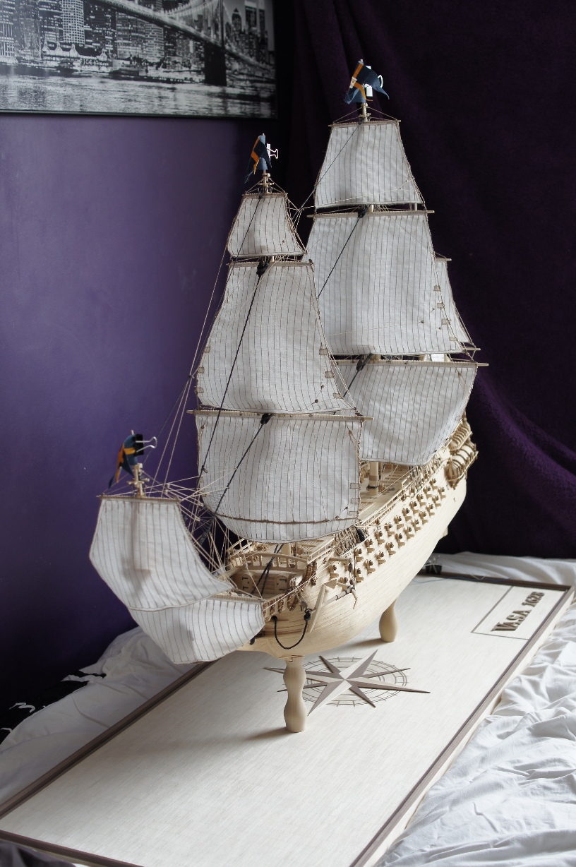 podczas tego czasu wykonałem wszystkie żagle wraz z olinowaniem, zamontowanie tych elementów było dla mnie ogromnym wyzwaniem. Niektóre żagle były istnym koszmarem i nie jestem w pełni zadowolony z ich kształtu, ale robiłem co w mojej mocy aby nad tym zapanować. W niedługim czasie pojawi się u mnie gablota ze szkła hartowanego 6mm,która była ogromnym wydatkiem - mam nadzieję że idealnie będzie pasowała do podstawy. Malowanie flag jest bardzo ciężkie ze względu na chłonność materiału, sąsiadujące włókna podbierają kolor i namalowanie detali jest bardzo utrudnione.