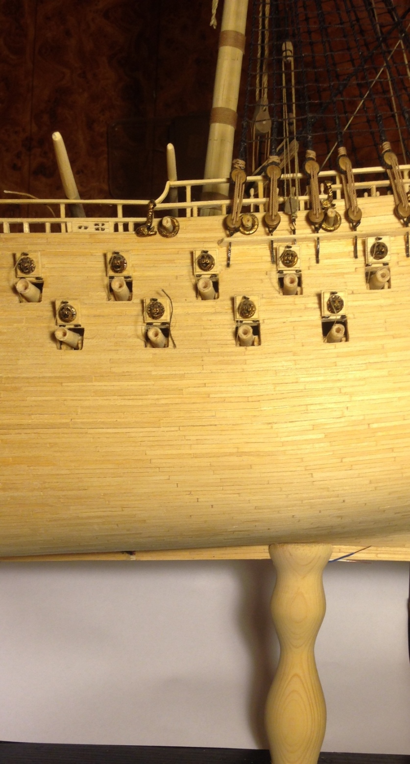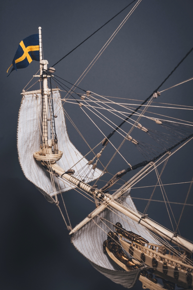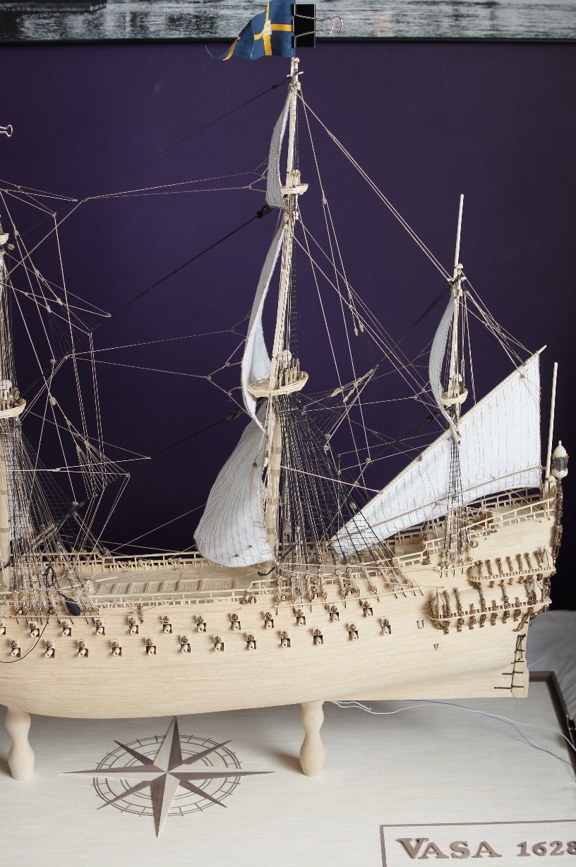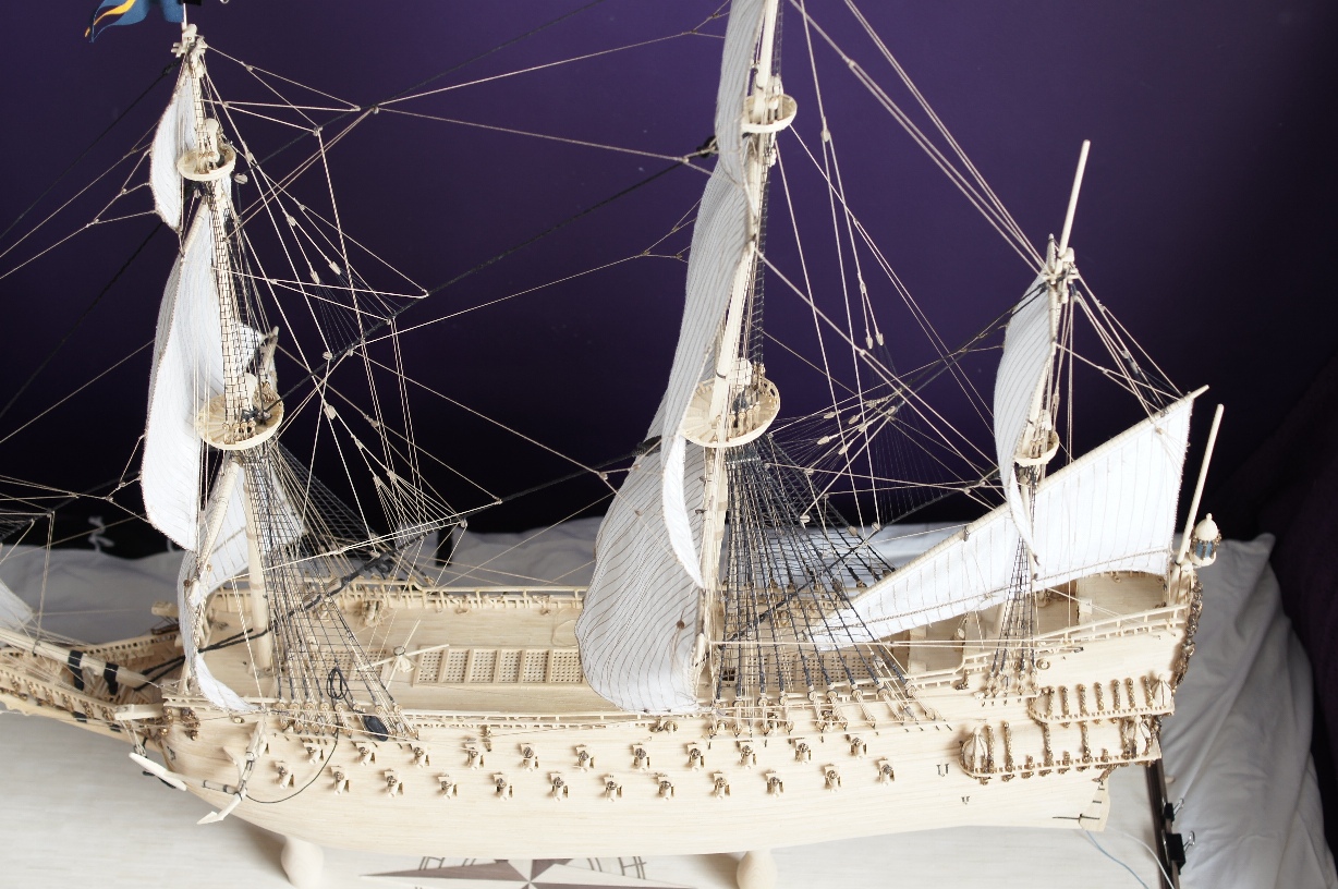 podczas tego czasu wykonałem wszystkie żagle wraz z olinowaniem, zamontowanie tych elementów było dla mnie ogromnym wyzwaniem. Niektóre żagle były istnym koszmarem i nie jestem w pełni zadowolony z ich kształtu, ale robiłem co w mojej mocy aby nad tym zapanować. W niedługim czasie pojawi się u mnie gablota ze szkła hartowanego 6mm,która była ogromnym wydatkiem - mam nadzieję że idealnie będzie pasowała do podstawy. Malowanie flag jest bardzo ciężkie ze względu na chłonność materiału, sąsiadujące włókna podbierają kolor i namalowanie detali jest bardzo utrudnione.
