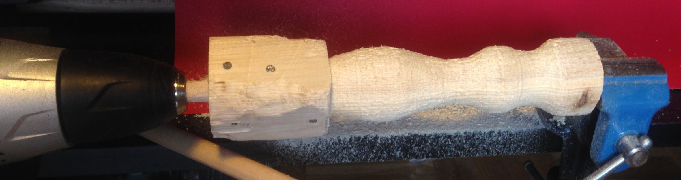 Obawiałem się wykonania "tralek", które będą bezpośrednio podtrzymywały Vasę. Na razie wykonałem 1 sztukę, ale już wiem,że jest to możliwe.Z zakupionego fragmentu drewna (sosnowego?) o wymiarach 4x4x200 [cm] odciąłem z 25 cm w celu próby osiowego zamontowania w "tokarce". Najbardziej prymitywny motyw: wiertarka przymocowana na nogi biurka oraz gwoździa w imadle. Efekt jest zadowalający,ale nie powalający.