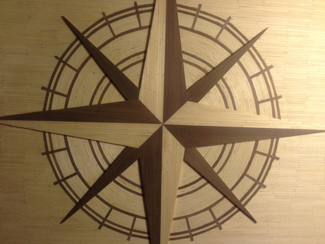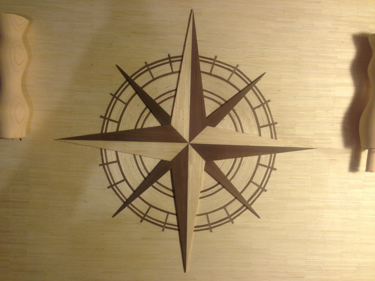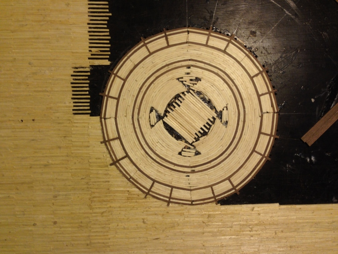 Miałem problem z doborem materiału do wykonania róży wiatrów, starałem się nadać kolor zapałkom,ale kąpiel przez całą noc, ani podgrzewanie aby zwiększyć chłonność zapałek nie pomogło. Dlatego zdecydowałem się wykonać detale z ciemniejszego orzechowego drewna - posiadałem listewki 7x2 mm oraz 5x5mm które zakupiłem kiedyś przy okazji. Po nasączeniu w wodzie udało się je dość swobodnie kształtować, ale nie udało się uniknąć pojedynczych pęknięć.